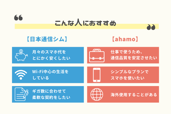 - ahamoと日本通信SIM、どちらが自分の使い方に合っているのか迷っている